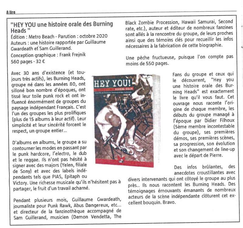 « Sur plus de 500 pages, le lecteur traverse les décennies comme les générations, constatant au passage à quel point le décor underground français a bien changé depuis la fin des années 80… A la fois drôle, honnête et croustillant, Hey You! tend aux Burning Heads une résonance éternelle et bien méritée à leur leitmotiv « fun, passion, énergie » comme il offre à leur public une lecture immersive, sans curiosité malsaine, amenant pas mal de réponses aux questions qu’on pouvait encore se poser au sujet de ce groupe emblématique ayant constamment évolué en faisant fi des modes et des notions de marketing. » - MOWNO